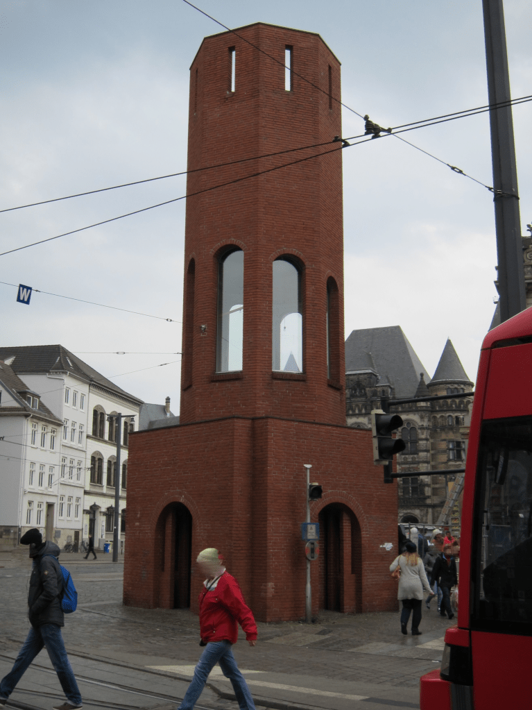 En tanke i en anden retning: tårnet som en del af et større værk sammen med rummet og menneskerne på pladsen. Tårnet står jo på ingen måde alene på Domsheide.