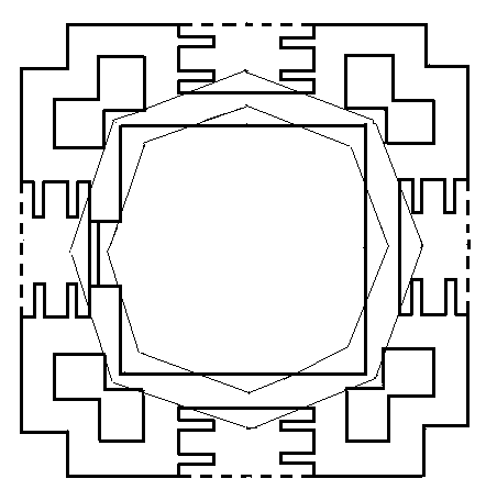 Lægger man overbygningens oktogon på underbygningens grundplan, får man et tempelagtigt udtryk med 4 indgange til en form for (hellig) plads eller kerne i midten. Det kan give visse associationer til Andronikos’ ottekantede observatorium (Horologium), også kaldet ‘Vindenes Tårn’, i Athen.