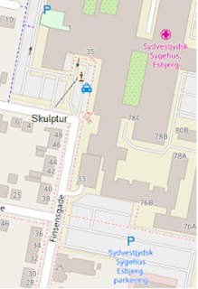 In front of the main entrance to Esbjerg Hospital (now Southwest Jutland Hospital) stands a large building sculpture by Per Kirkeby. The sculpture stands in the middle of a kind of roundabout or turning point for cars going to and from the hospital with patients.