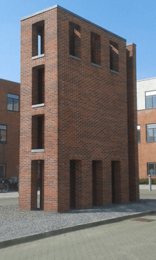 The sculpture is made of red brick and has the shape of a tall, narrow house or tower. It is approximately 8 m high, 6 m long and 2 m wide. The sculpture has an outer and an inner wall. There is a room within the room…