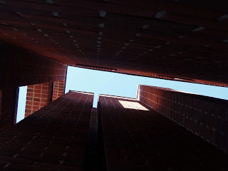 Mellem ’vinduernes’ karme for oven og den indre kerne er der åbent mod himlen, og det giver solen mulighed for at danne lys og skygge på murene i ’vinduernes’ sider og på muren bag ’vinduerne’. Og det giver oplevelsen af noget, der ser ud og ned.