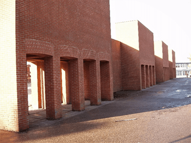 The sculptures and the spaces they form with the hall give associations to something southern, Moorish. There are Arab walls, towers, narrow alleys, a large square with gravel. And the school and the nearest homes are kept in a dense, low building. Is the work an ‘Alhambra’ – which means the red castle – in Ballerup? [2] But the sculptures’ connection with the sports hall and with the playing fields can also give rise to thoughts about games and, in connection with this, reflections that are not only about winning or losing, but life situations in a broad sense.