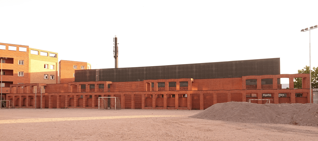 The sculptures stand around and parallel to a sports hall, Egebjerghallen. They screen off the hall and create spaces for recreation and games. A purpose that they support in different ways and with different expressions. You can see them as architecture, but they have some aesthetic and significant elements that go beyond the purely building construction.