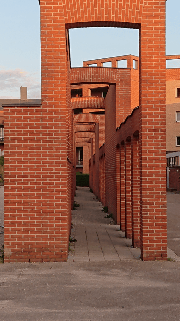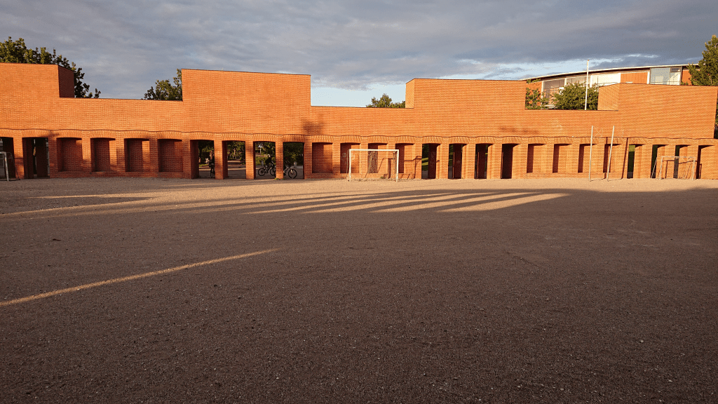 Skulpturerne og de rum, som de danner med hallen, giver for mig associationer til noget sydlandsk, maurisk. Der er arabiske mure, tårne, snævre gyder, en stor plads med grus. Og skolen og de nærmeste boliger er holdt i en tæt, lav bebyggelse. Er værket et ’Alhambra’ – som betyder det røde slot – i Ballerup?[2] Men skulpturernes sammenhæng med sportshallen og med boldbanerne kan også give tanker om spil og i forbindelse hermed refleksioner, der ikke kun handler om at vinde eller tabe, men livssituationer i bred forstand.