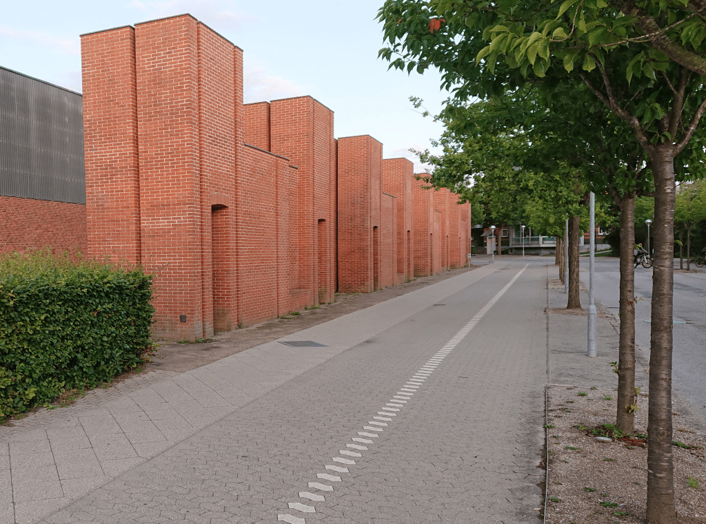 Mellem mur 1 og hallen ligger en smal plads, nærmest en gyde, som er asfalteret. Kirkeby har bevidst valgt at gøre den smal – ‘en kedelig gade bliver interessant, når den er smal’, siger han.