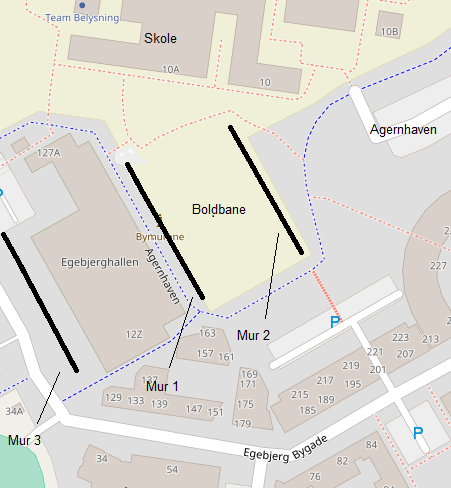 I Egebjerg kvarteret i Ballerup tyve km nordvest for København, står tre bygningsskulpturer af Per Kirkeby. De er bygget i røde sten og meget store selv efter Kirkeby forhold: godt halvtreds meter lange, to en halv til tre meter brede og fem til syv meter høje. Per Kirkeby omtaler dem selv som ’mure’ [1].