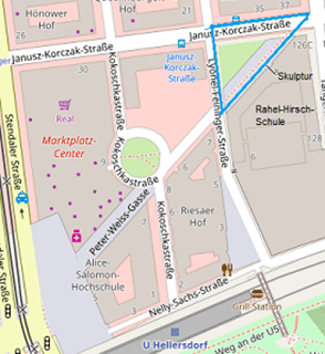 Hellersdorf Mitte ligner et område, der er opbygget efter en nyere byplan med en form for overordnet idé. Jeg har ikke kunnet afklare, om bydelen blev total ødelagt under 2. Verdenskrig. Peter-Weiss-Gasse med skulpturen ligger i Mitte’s østlige del, og gaden skærer denne del igennem diagonalt – som en planlagt passage eller genvej, se kortudsnittet. Bygningerne i området er nyere etagebyggeri i 3-4 etagers højde opført i pudset beton, dog bortset fra Rahel-Hirsch-Schule i gule mursten. Der er en blanding af boliger, butikker og serviceerhverv. Udover Rahel-Hirsch-Schule ligger Alice-Salomon-Hochschule, en socialpædagogisk faghøjskole ved starten af Peter-Weiss-Gasse.