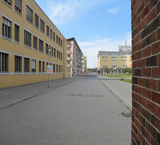 På vestsiden langs Lyonel-Feininger-Straβe ligger i den nordlige ende et gråt 4- etageboligbyggeri. Den sydlige ende står åben mod et indkøbscenter med et græsareal foran og etageboligernes ’bag-gård’. Man kan få et vist indtryk heraf på foto 4.