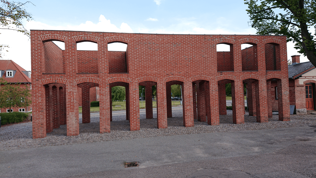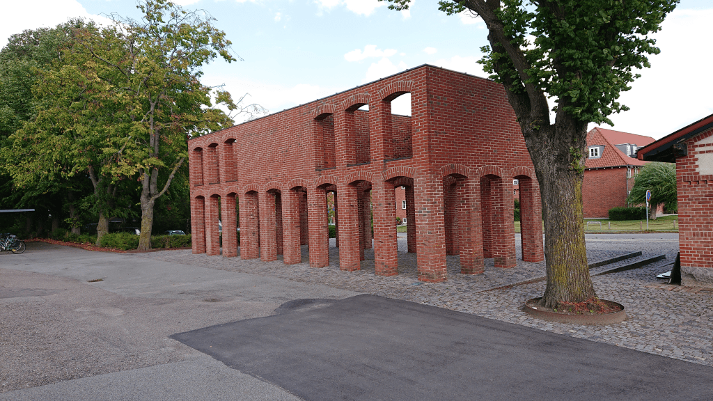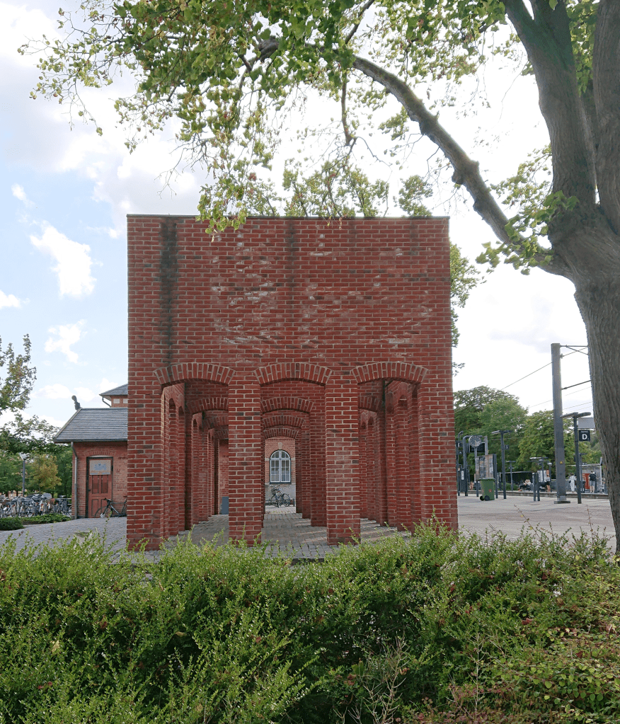 In Humlebæk, 40 km north of Copenhagen, known for the Louisiana Museum of Modern Art, there is a red brick building sculpture by Per Kirkeby on the platform of Humlebæk Station facing the Kystbanen railway line. The sculpture dates from 1994 and stands in extension of the station building. Although it can be seen as an “annex” to the station, it is not a sculpture that can be overlooked. It is 5 metres high, just under 5 metres wide and around 13½ metres long.