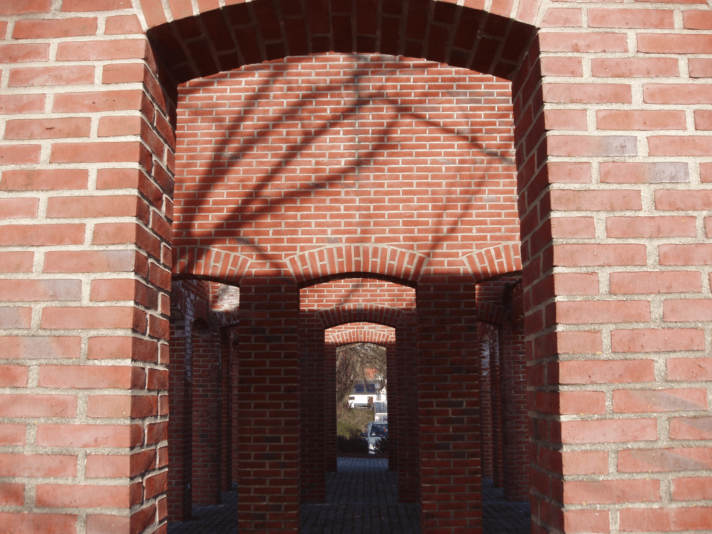 Men søjlerne og åbningernes form betyder også, at blikket naturligt søger op mod de øverste åbninger og de store lukkede murpartier. I skulpturens øverste langsider er der to lukkede murpartier mod øst (Strandvejen) og én mod vest (banesporene). De lukkede, øverste murstenspartier skaber med deres mæanderforløb en form for mystik om, hvad der er indeni på et øvre plan… er der noget skjult her?
