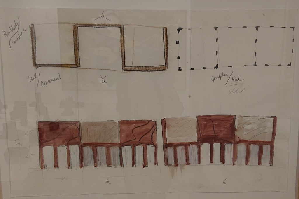 Figur 1 viser en tegning, som Kirkeby har lavet til museet af de to grundplaner samt værkets to lange sider. Han kalder det nederste plan for ‘hallen’ og det øverste for ‘ornament’.