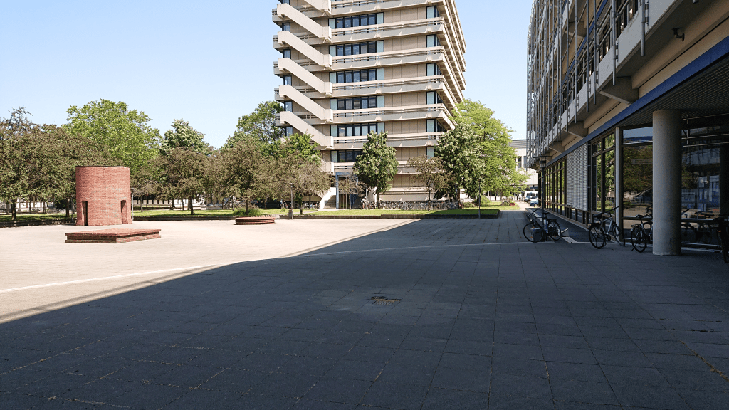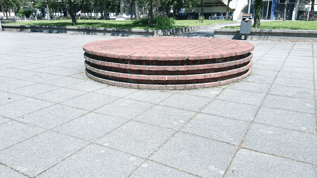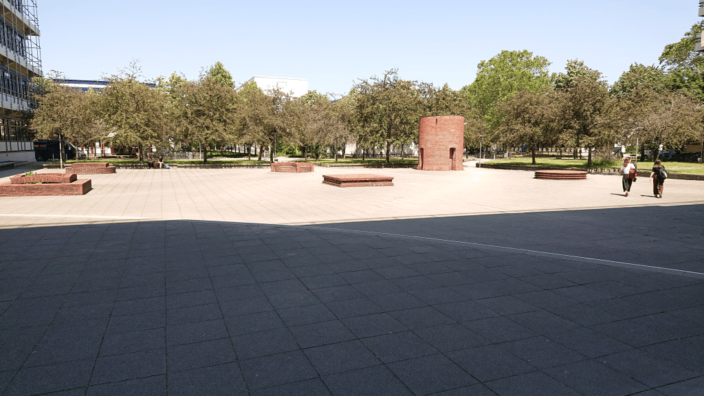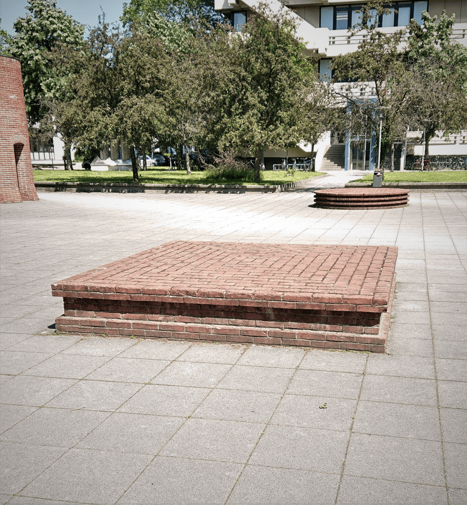 The sculptures stand on a larger, tiled square in an inner courtyard in the campus area. The inner courtyard is formed by 2 buildings at an angle. The site is accessed from a large opening in the corner of the angle and from a number of paths leading around the area. The sculptures are placed in 2 rows in the square, which is slightly lower than the buildings. Around the square there is a concrete edge with seating. There is something desert-like about the square, but also something ‘schoolyard’ qua the location and the tiles.