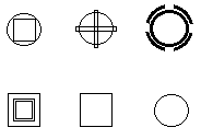 De 6 skulpturer har den simple geometri til fælles. Deres grundplan er enten et kvadrat eller en cirkel. Der er 4 med cirklen som grundplan og 2 med kvadratet. Af de flade skulpturer har kun Cirkel og kors en form for udtræk i forbindelse med korsets ender/befæstning. Tårnet er bygget som 2 tårne indeni hinanden, så grundplanen kan tegnes som en 2 koncentriske cirkler. I den yderste cirkel er 4 åbninger placeret diametralt overfor hinanden. Udover at sammenligne Tårnet et øje med den indre cirkel som pupillen, som holder øje med de øvrige skulpturer, henviser Kirkeby til den franske arkitekt Ledoux’ tegning af et øje, som reflekterer verden udenfor (note 3).