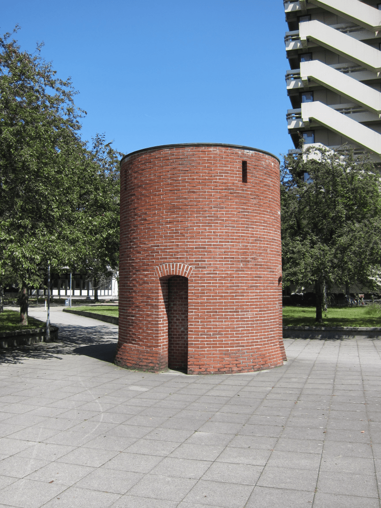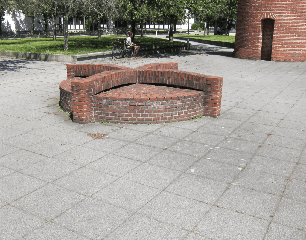 Kirkeby himself has described some of his thoughts with the sculpture [3]. For example, that the Tower seen from above can be seen as a pupil in an eye. It must keep an eye on the other pieces in the square. Another motive he calls running ‘the forehead against the wall’, as a comment on the place and research. But the sculptures can also be embedded in other spheres and references. With the ‘schoolyard’, thoughts are created for school time, and the students and the sculptures create a tableau, a dynamic work. It is also natural to get associations with a cultic place with sacrificial benches and more or less eerie ceremonies. Or to Christian references.
