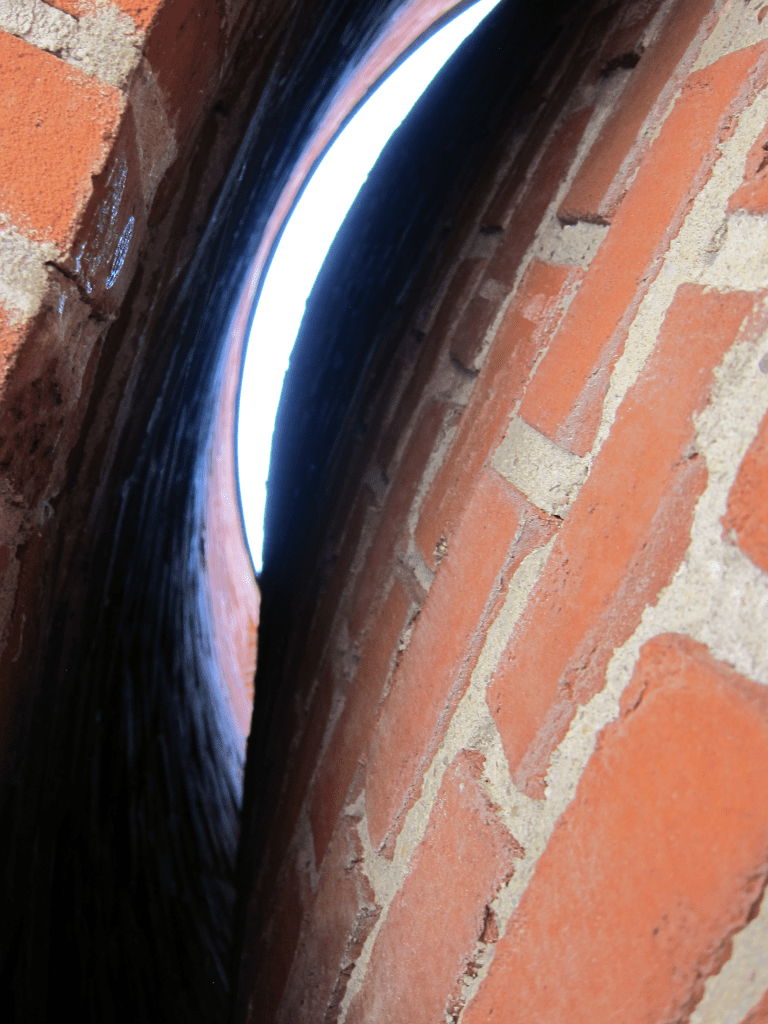 Åbningerne i Tårnet stod med høj sol med en mørk skygge foroven dannet af buestikkene. Det gjorde åbningerne mere dybe og gav skulpturen lidt hulepræg. I de smalle spalter øverst dannede lyset sorte, tykke streger i skæve vinkler, mens man i vinkelret synsvinkel kunne se igennem. Så man ind i rummet mellem de 2 mure var den nederste del mørk skygge og den øverste del over den inderste mur stod som en lys bue (foto 11).