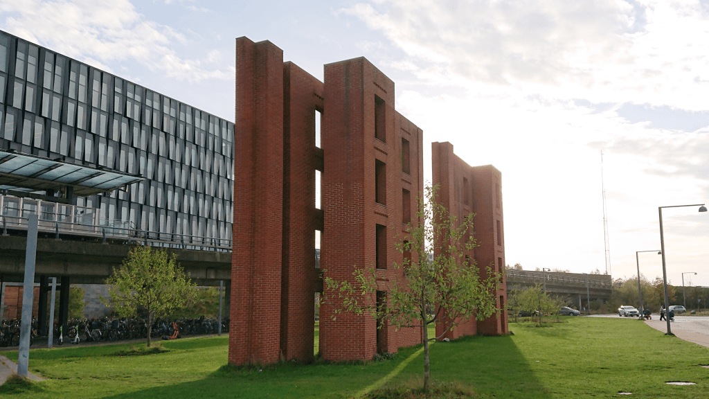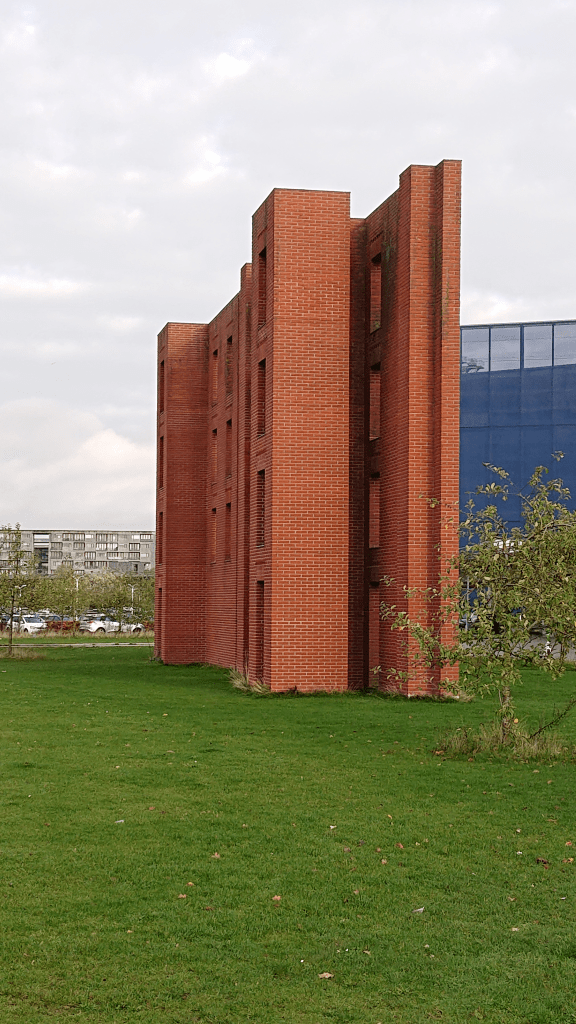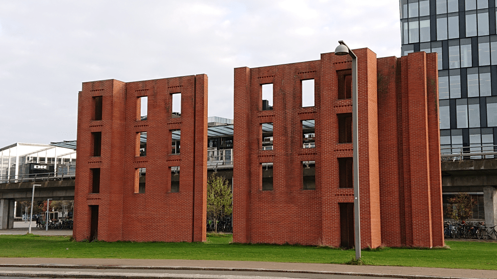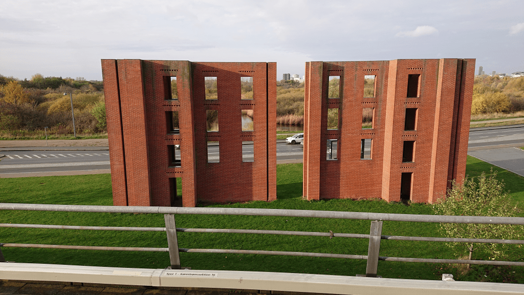 Per Kirkeby himself spoke at the inauguration in 2004 about the “strange building”. He said of the location, ‘the sculpture stands right where nature flows in. If you come from Fælleden, you encounter the sculpture as a sign of the city. The sculpture is so strange and distinctive that if you send your children on the Metro, you can tell them to get off at the strange brick thing…’ [1]. Is the sculpture an alternative metro station? In any case, it has different spaces and different travel options than a normal station!