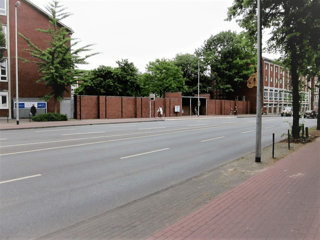 ’Skolegårdsrummet’ er ’privat’ rum for universitetets studerende og personale (se foto 2 og 4). Rummet afgrænses på 3 sider af 2-3 etagers, forholdsvis anonyme bygninger og af Bushaltestelle på den fjerde. Mellem Bushaltestelle og den nordlige fløj er der en åbning til ’gården’ på omkring 3,5 meter fra gaden. Bunden i skolegården er omtrent kvadratisk med sider på omkring 50 meter og består primært af et asfaltareal med spredte træer på mindre græsarealer. Langs Bushaltestelle er der i den ende asfalt/fliser og i den anden græs.