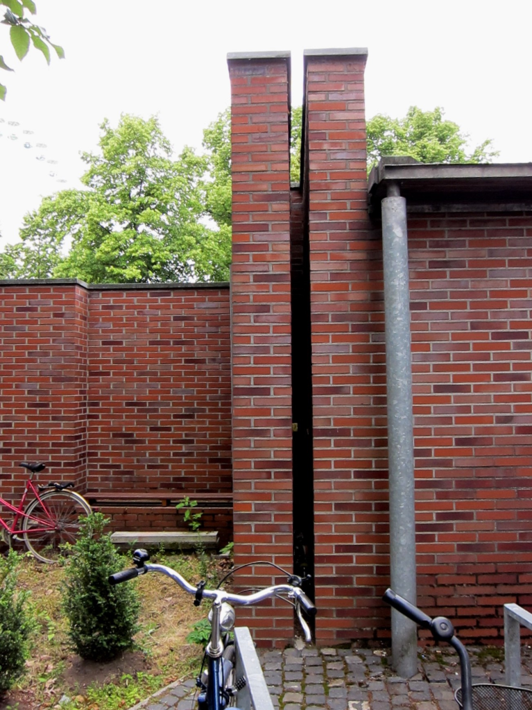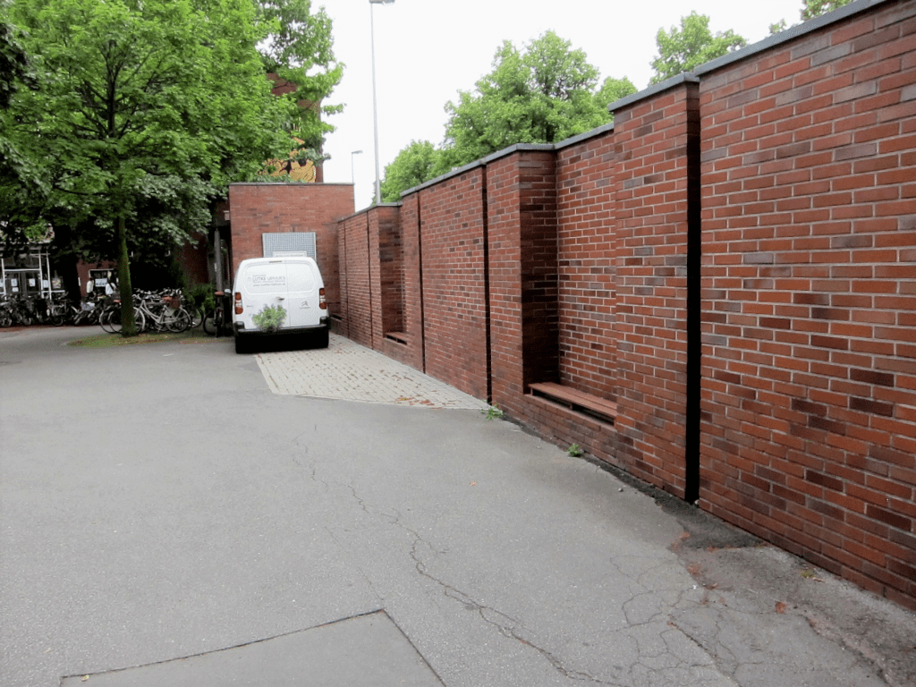 I skolegården står murens mæander heller ikke i fuld højde i indtrækkene, idet der i bunden er muret bænke – se fotos. Læskuret står som et udtræk i midten, så man har ikke det lange uforstyrrede synsfelt af muren, som i gaderummet. Bushaltestelle står mere som ’brugsting’ i dette rum. Læskuret virker i gårdrummet som ’et lille hus’, da man ikke kan se den store åbning, og da sidemurene har de vindueslignende åbninger. Den ’overdrevne’ dybe spalte i sidemurene giver mig associationer til et dybt sår eller mere lavpraktisk, en fejl i byggeriet, som ikke er blevet fjernet – nogen har målt forkert…