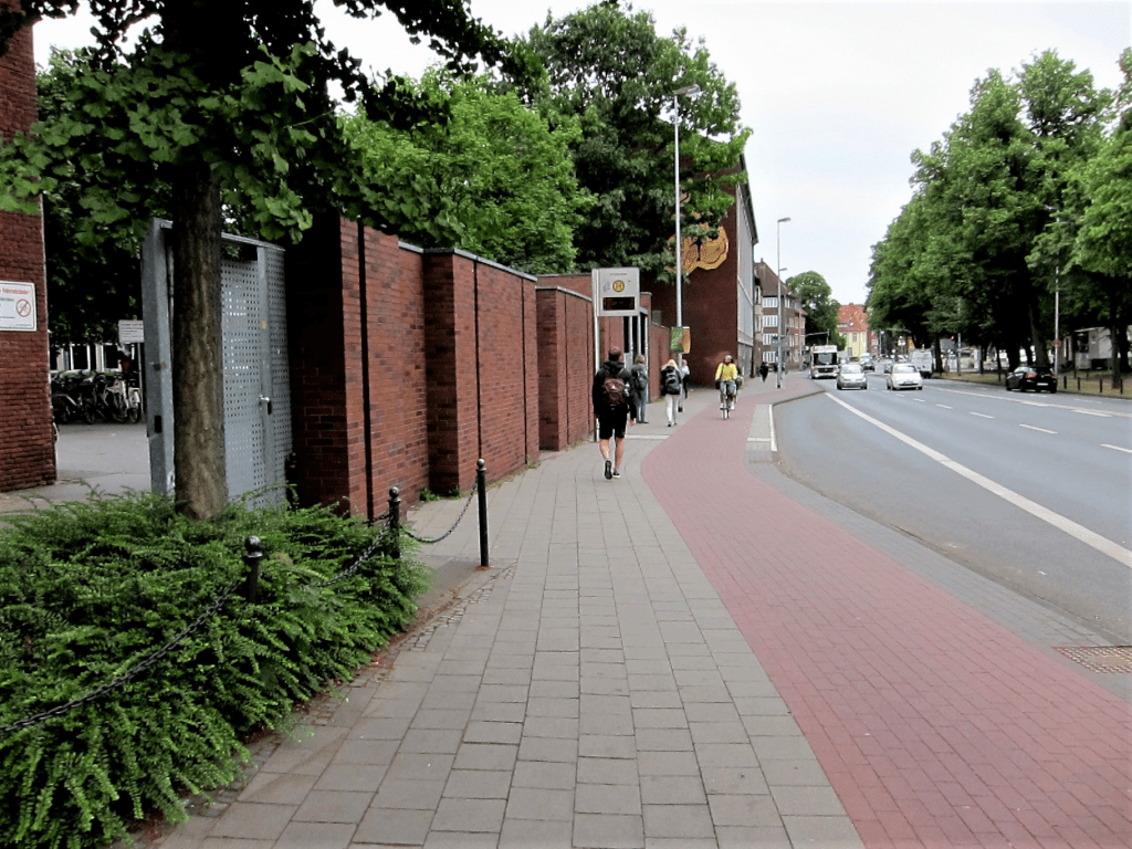I Skulpturprojektåret 2017 var der sidst i juni måned mange ’skulpturturister’, som lagde vejen forbi Bushaltestelle og en ny, højt ophængt, flad træpladeskulptur på gavlen mod syd af Sany (’Fallande ting’). Jeg kan ikke umiddelbart se nogen sammenhæng mellem Bushaltestelle og Sany’s skulptur. ’Turisterne’ var både folk fra Münster, andre tyske byer og udlændinge. Men jeg betragter ikke ’skulpturturisterne’ som en primær målgruppe for Kirkebys mur.