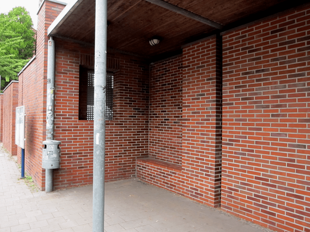 Bushaltestelle er en lang, lige halvanden sten mur med et dybt indtræk i midten, som danner et rektangulært, åbent rum til buslæskuret.