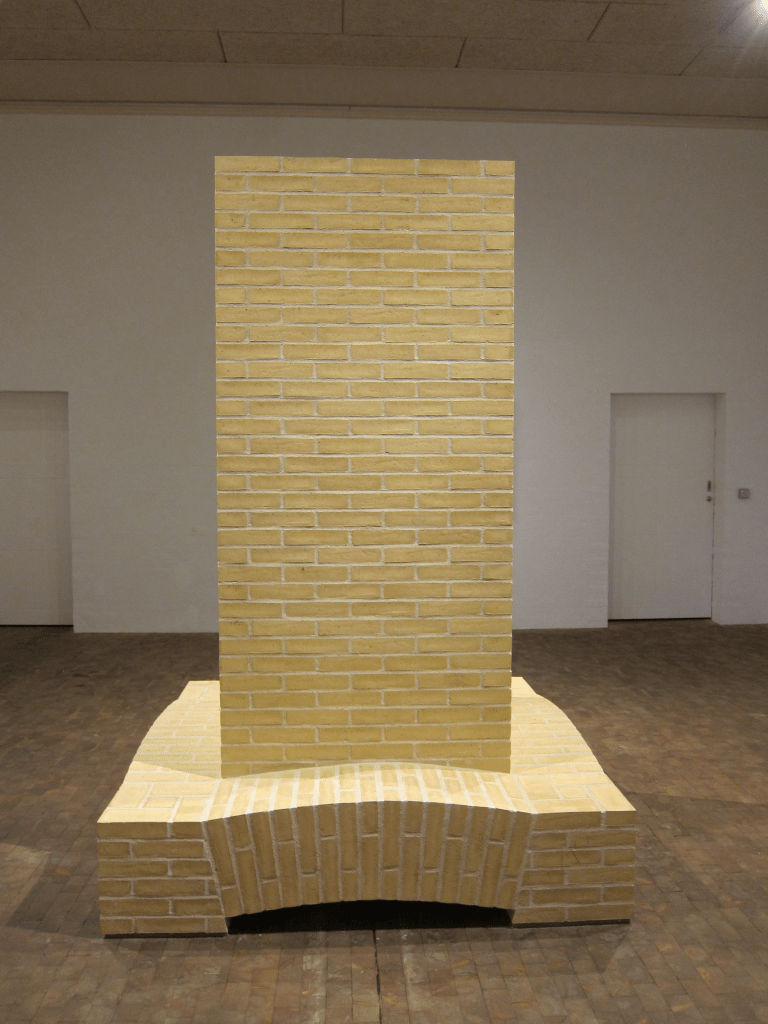 Skulpturen stod uden synlig sokkel, men givetvis på en plade for at skåne trægulvet. Den løftede sig i hvert fald en smule fra gulvet. Den manglende sokkel gjorde, at skulpturen bragte sig selv i spil som sokkel. Man kunne opfatte buestikkene som sokkel eller et stillads for det lille tårn eller se skulpturen som helhed som en sokkel, hvor den egentlige skulptur manglede, var fjernet eller glemt… Skulpturens mursten var sandfarvede, bleggule, der var en vis sarthed over dem, og de var lagt i et simpelt halvstensforbandt med lys mørtel.