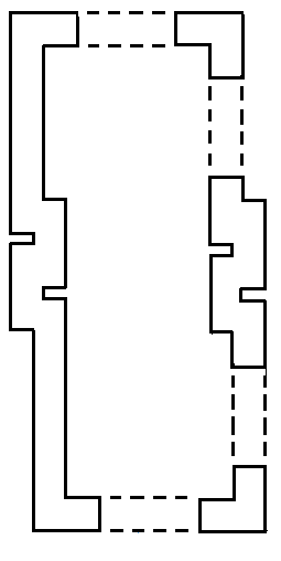 De lange sider blev sat sammen med 2 ens ender, hvor åbningerne i midten havde samme størrelse som vest murens åbninger, foto 4. Endemurene var kun omkring 2½ m brede, som om skulpturen trak sig sammen…
