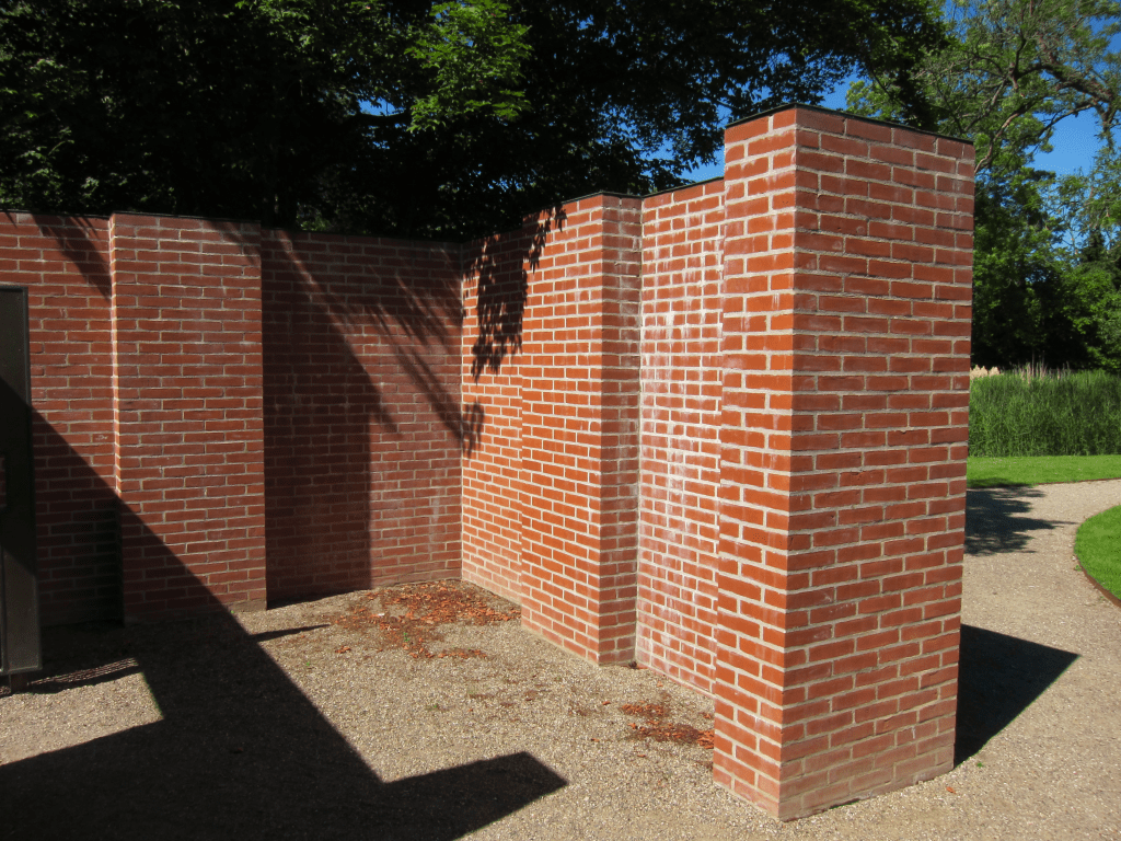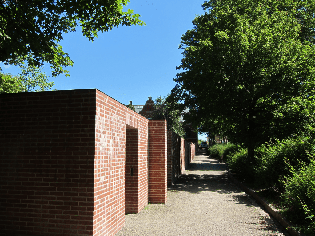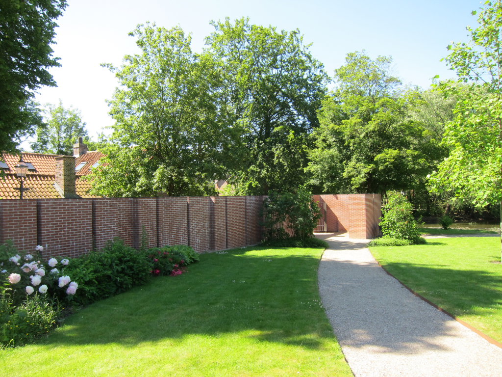The wall is a long red brick wall measuring approximately 70 meters. It is attached to the museum at one end and ends in a small square room, a ‘loop’ as Kirkeby calls it, at the other end towards Ribe Å. The height varies between 2 and 2½ meters, as the terrain slopes towards the stream. The garden wall divides the space into a garden for the museum and a passageway to a bridge over the river.