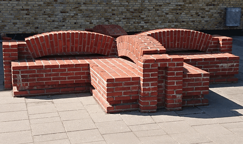 The sculpture is located in the middle of a walkway to the school and is made of red bricks. It is just under 1 metre high and around 4.20 metres wide. It can be described as “a cross on a cross” in the form of two horizontal Greek crosses with equal arms. The lower cross is wide and box-shaped, while the upper cross is narrower and consists of slightly raised arches. The Cross Bench was erected in 1986 and was part of a series of three sculptures with the same basic form but with variations in the individual elements. See the notes on the blog about Kiel and London.