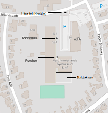 Skulpturens umiddelbare omgivelser er et stort fliseareal fra Jyllandsgade til gymnasiets indgang med en af gymnasiets gule murstensfløje på den ene side og en grøn lav hæk på den anden side mod parkeringspladsen, foto 2 og kortudsnittet.