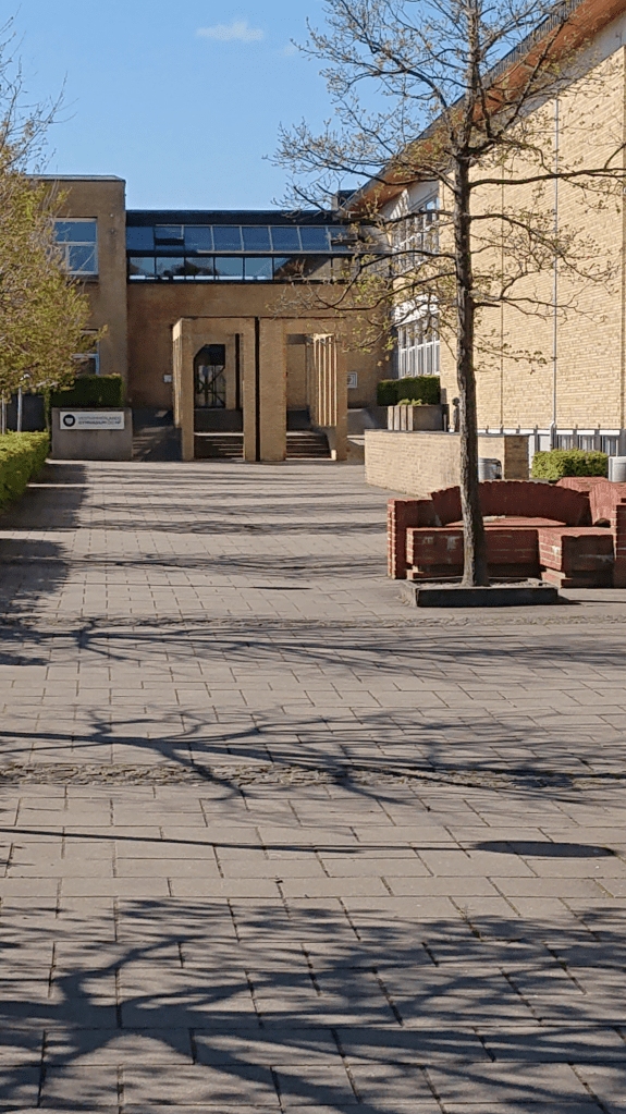 Indgangsarealet til gymnasiet domineres af et stort fliseareal. En anden af Kirkebys skulpturer ’Korsbænken’ (i røde mursten) er placeret på dette areal, og bryder delvist flisearealets store grå flade, foto 3 nedenfor. Mellem de to Kirkeby skulpturer står Knud Nellemoses (mindre) bronzeskulptur af en lille nøgen dreng, ‘Ib‘. Skulpturen kan skimtes til højre bag træet på foto 3.