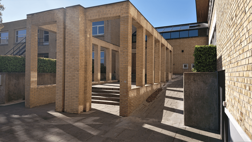 Foto 3: Indgang til gymnasiet med ’Propylæerne’, ‘Ib’ og ’Korsbænken’ set fra nord
