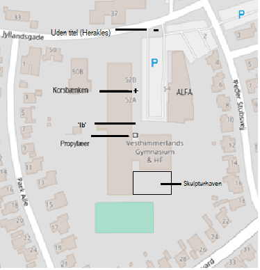 In front of Vesthimmerlands Gymnasium stands a yellow brick sculpture by Per Kirkeby. The sculpture is located at the entrance to the grammar school. Kirkeby has named the sculpture “Propylæerne” (The Propylaea) [1].