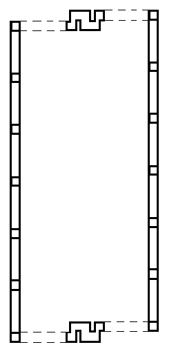 Skulpturens sideflader består af 5 (7 hvis enderne tælles med) kvadratiske mursøjler, som er omkring 35 cm bredde (1½ sten), med åbninger imellem dem på godt 1,40 m. Ser man skulpturen fra siden er associationen til et græsk tempel umiddelbar. Mursøjlerne står på sidemure, der optager højdeforskydningen i terrænet, således at skulpturens øverste kant har samme niveau på alle sider. Sidemurene er forskudt i 2 plan. Mod nord har de en højde på omkring 1 m over terræn, foto 6, mens de mod indgangspartiet og syd er ’forhøjet’ med yderligere cirka 70 cm, se foto 7. I Kirkebys geologiske univers en slags tektoniske blokke, der har forskudt sig.