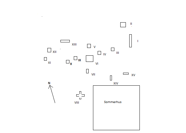 Sommerhuset ligger i et åbent område på i alt omkring 4-5 hektar. Det er afgrænset af skovkanter bortset fra østsiden, som ligger åben mod marker. Jeg opfatter områdets form som rektangulær. Bunden er flad mark med slået græs og enkelte træer. Der er ikke anlagt stier eller veje. Udover atelieret ligger her en tennisbane.