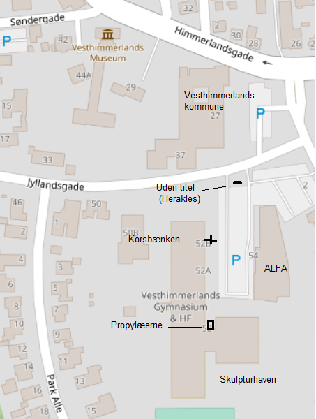 Foran Vesthimmerlands Gymnasium står en stor, sort bronzeskulptur af Per Kirkeby. Skulpturen er opstillet i 1992 og placeret ved indkørslen til gymnasiet. Kirkeby har kaldt sin skulptur for ’Uden titel (Herakles)’ [1].