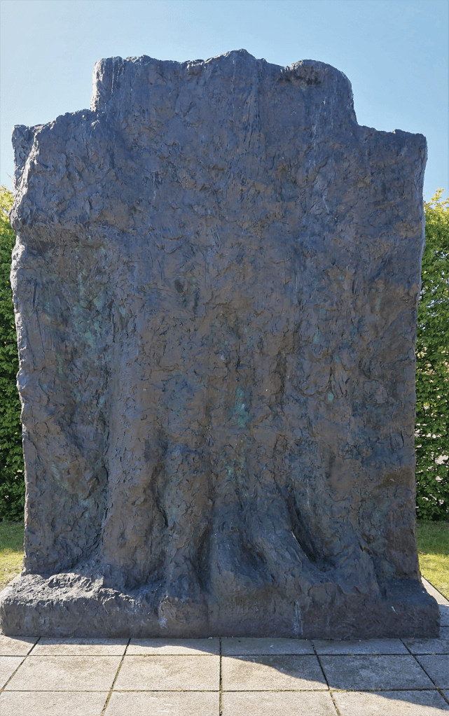 The contour of the sculpture is almost completely square, but without corners at the top. In a way, a gate, but not a ‘real’ gate. Its surface is uneven and woolly, as if it is still in some kind of process. You can faintly see fragments in the front from a distance. At close range, the fragments form hints of legs, feet, body, arm, head, and some snake-like parts, but they somehow slide into the sculpture as if they are being swallowed up or dissolved by the background.