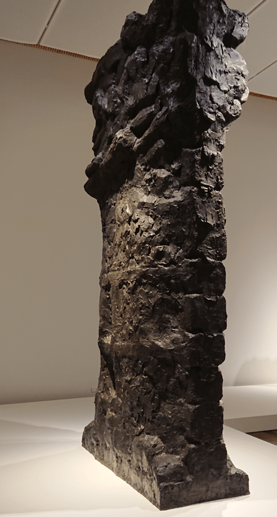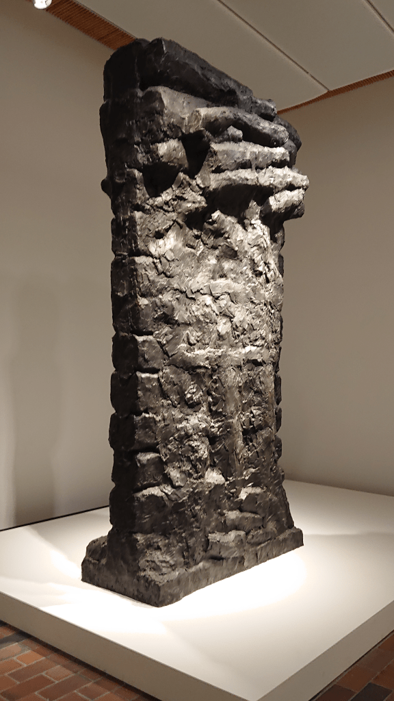 Rum og skulptur skaber kontrast til hinanden i materialer og form … Stor stele står som et fund fra fortiden, som noget man har taget med fra en tidligere periode. Det er som om, at der kun mangler en montre eller afskærmning omkring den. Der er noget ’Grauballemand’ her, og den sorte bronze (sort moseeg…) forstærker dette udtryk.En placering udenfor ville ikke give samme associationer.