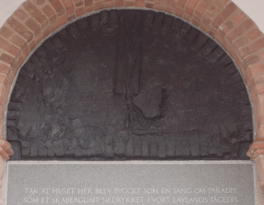 Granitbjælken bærer en nyere inskription fra 2015 fra en salme af Jens Rosendal (se foto 1): TAK AT HUSET HER BLEV BYGGET SOM EN SANG OM PARADIS SOM ET SKABERGLIMT NEDRYKKET I VORT LAVLANDS TÅGEDIS. Jeg oplever inskriptionen som indgangsord til kirken og ikke som en undertekst til relieffet. Det har noget at gøre med relieffets udtryk og motiver, j.fr. nedenfor.