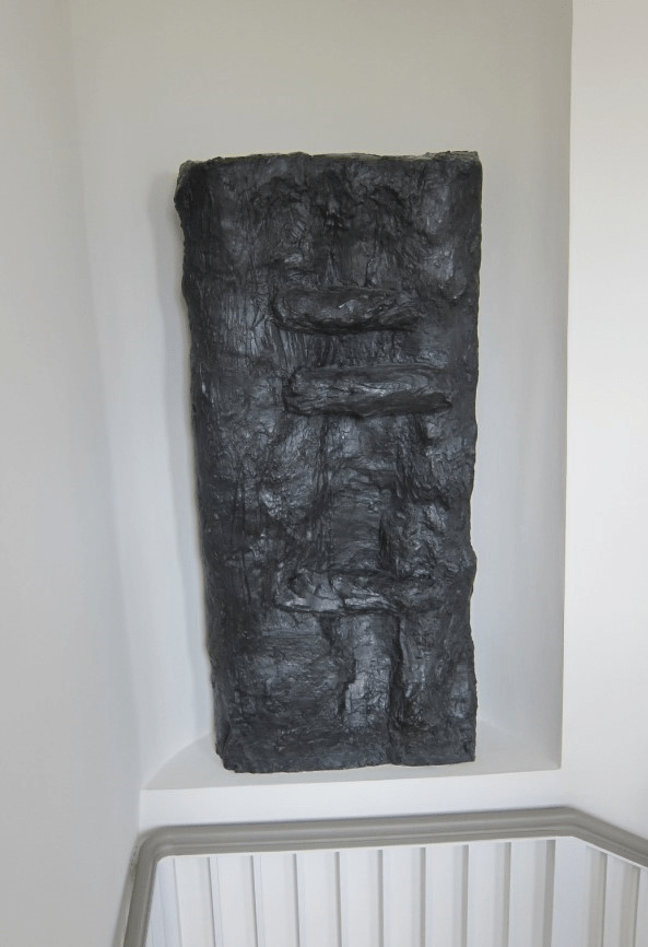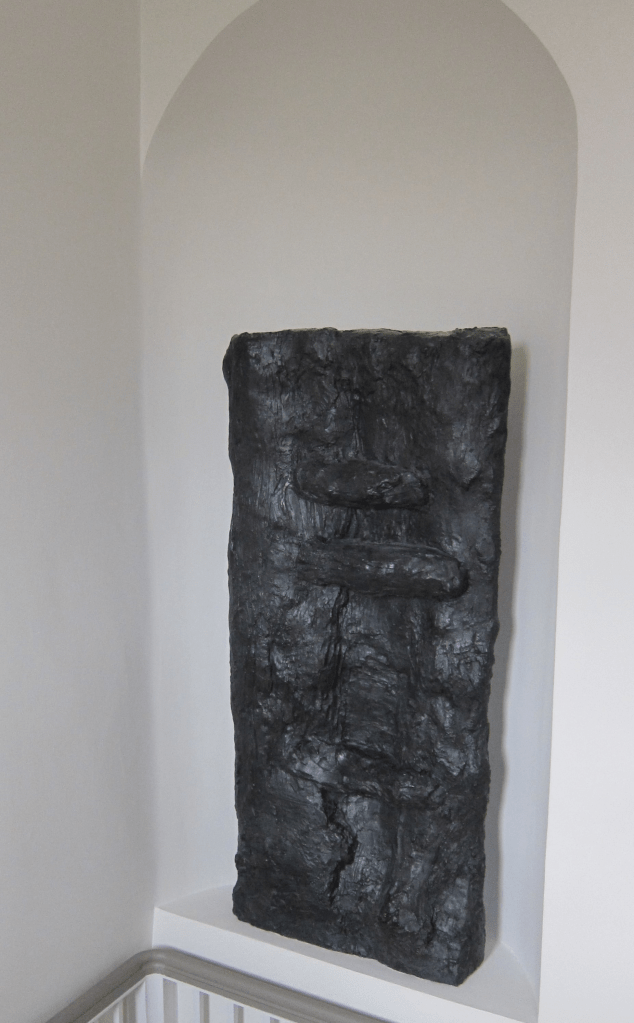 Jeg tror, at mange som jeg vil få associationer til en dør, en port. Skulpturens flade firkantede form og placeringen i væggen lægger op til det, både når man står i hall’en og i trappefordelings gangen. Med nichens indad buede form som bagvæg skaber skulpturen indtryk af en dør ind til/ud fra en grotte, et hemmeligt rum til noget dybere, som er skjult for os. Og det er en særlig dør. Den spærrer kun noget af ind/udgangen, men ikke hele hullet. Den er heller ikke intakt, der er en dyb huling, spalte i den, som om den er ved at gå i stykker, eller at nogen har forsøgt at bryde igennem. Har nogen prøvet at udbedre døren eller afsikre adgangen med bjælkerne på tværs? Er det noget farligt eller vigtigt, der holdes skjult eller indespærret…?