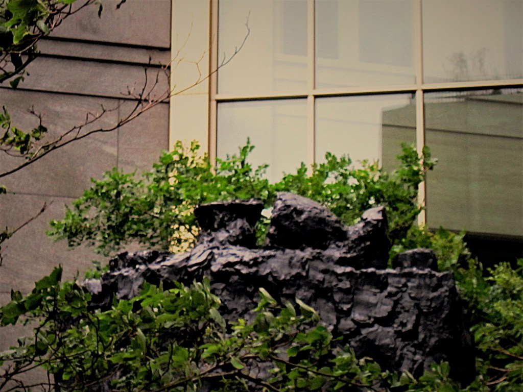 Bagsiden – mod nordøst og justitsministeriet, se foto 5. Bagsiden indeholder i forhold til forsiden kun få fragmenter, og selvom overfladen er ’ulden’, får man ikke et indtryk af bevægelse i materialet. Kirkebys ’stilleben’ på toppen er også mere tydelig på grund af den mindre urolige flade, der kun har et smalt berappet lag mod toppen. ’Hylderne’, ’afsatserne’ eller ’trapperne’ i midten fanger min opmærksomhed først. Der er 3 ’hylder’ placeret i skulpturens midte fra 1½ til 2½ m fra foden. Sammen skaber de et indtræk opad på 30-40 cm i forhold til bunden. Jeg ser dem mere som ’hylder’ end som trin – de er svære at gå på. I kraftigt regnvejr giver de måske en spændende kaskade effekt. ’Hylderne’ skærer skulpturen igennem og lukker for ’dynamikker’, især når man står frontalt mod siden. Hylderne kan ligne tilhuggede sten, men også mærker efter spadestik.