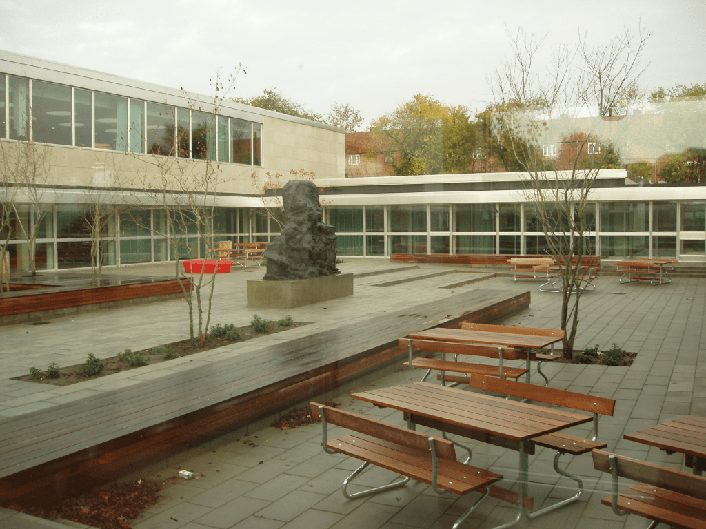 Stedet vil jeg ikke betegne som idyllisk. Det ligner lidt en fængselsgård – der er grå og afdæmpede farver – og virker koldt, når fliserne er regnvåde en efterårsdag. Holdes Laokoon fanget her? Hvad symboliserer det? Glasfacaderne skaber omvendt en transparens mellem gården og de omkringliggende lokaler, og dermed liv i rummet, når eleverne går eller sidder i lokalerne omkring atriumgården.