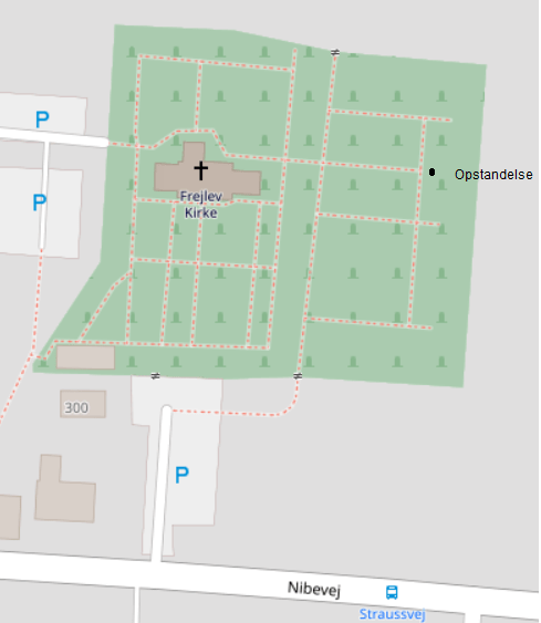 At Frejlev Church stands a large, black bronze sculpture by Per Kirkeby. The sculpture was erected in connection with the commissioning of a ‘cemetery annex’ east of the old cemetery and the church itself. Kirkeby has called his sculpture Resurrection. In addition to the sculpture, he has made stained glass windows for the church’s choir windows and a bronze altar table[1].