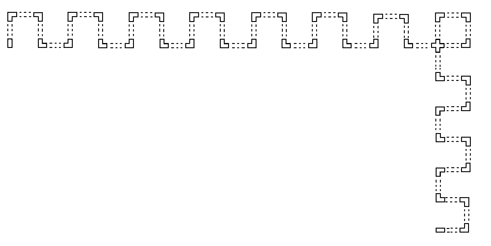 De brede mæandere er ’rene mæandere’ i den forstand, at grundplanen er ført igennem fra murens bund til dens top. Indtrækkenes rum er uden tag, er åbne foroven, så man kan se himlen eller omvendt, at man er ubeskyttet ovenfra.