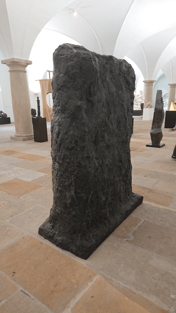 Tor I is in black patinated bronze. It is large, 220 cm high, 150 cm wide and 75 cm deep. The work resembles a rectangle upright, a thick ‘gate’ that has two column shapes on the front with a long, eye-shaped crevice in between. The back is relatively flat and anonymous. The surface is uneven on all four sides, slightly dented and alive underneath. Tor I is a heavy sculpture, but also has an elegance of its own and a certain fragility. The deep crevice in the middle gives a feeling of hollowness. The work is centrally located in the middle of the sculpture hall, close to an outer wall, and is highly visible even from a distance.