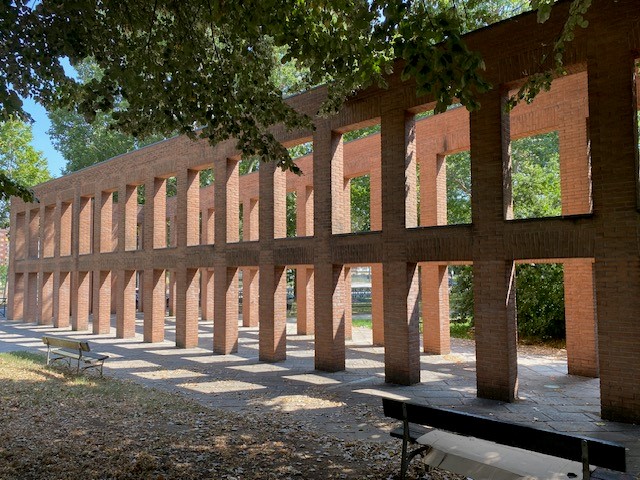 Opera per Torino is located just outside the city centre. The sculpture’s “large space” is a wide street running through the area. The work is located where the street turns and provides space for a small park with grass and tall trees. It is also a junction where several boulevard-like, busy streets diverge and intersect. Opera per Torino stands in the middle of the park, across its length, dividing the park. It makes the park and Opera per Torino a place that you do not just pass through, but are welcome to linger in. The work creates a series of fascinating light and shadow effects. For example, when the sun is in the south, the light creates paths in the sculpture, and the shadows cast by the work form a large grid pattern.