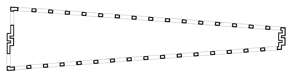 De lange sider er kendetegnet ved det store antal ens åbninger (seksten) og murpiller. Enderne ved en murforskyder, der knækker og parallelforskyder muren. I den brede ende er der to åbninger som brede døre, en indgang og en udgang? Den smalle ende er lukket.