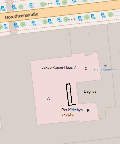 Jakob-Kaiser-Haus er uden sokkel. Det kan signalere, at værket er en sokkel i sig selv for noget andet… Men man kan også se det som, at den er noget, der vokser op af bunden, undergrunden nedefra.