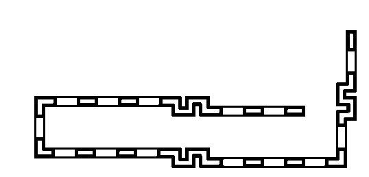 Grundplanen indeholder to parallelle mur, der står tæt på hinanden, og som er forskubbet ved hjælp af en murforskyder. De parallelle mure er i den ene ende sat sammen af en kort ’gavl’. I den anden ende er den ene mur længere end den anden, og den er afsluttet med forlænget gavl med en murforskyder. Der dannes således et åbent hul mellem gavlmuren og den korte mur. Geometrisk kan man tale om et smalt rektangel med en vinkel i den ene ende. Med lidt god vilje kan grundplanen minde om et smalt hus eller kolonnade med en læ mur.