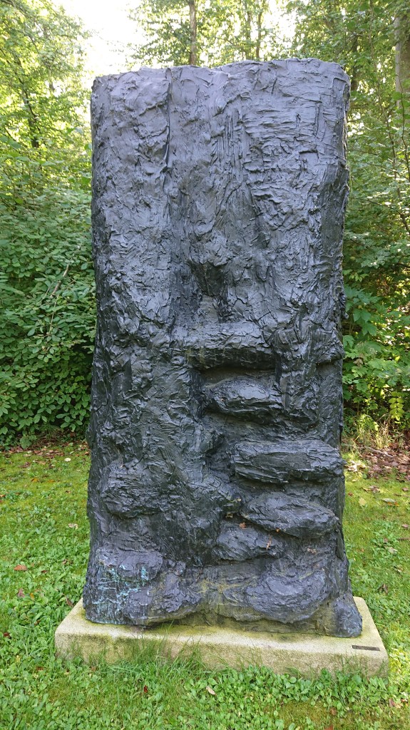 My thoughts and reflections start with the title. A stele is a memorial stone to someone or something that once was. Stele can therefore also be seen as a warning that we all become a memory ourselves… For Kirkeby, stele and stump are connected. A stump is not just a memory of a tree. It is in decay with worms gnawing at the interior. A picture of grudges and doubts? And Kirkeby’s worms are big… You can’t tell if there are several worms or if it’s one big snake. The serpent introduces an ambiguous symbolism, from death to resurrection and from falsehood to healing… If you look at the work’s pillar-like sides, they can symbolize two parts of a person’s life or two people. And the rounded fragments as forces that are at play between the parts or people. Maybe Stele is also a reflection…