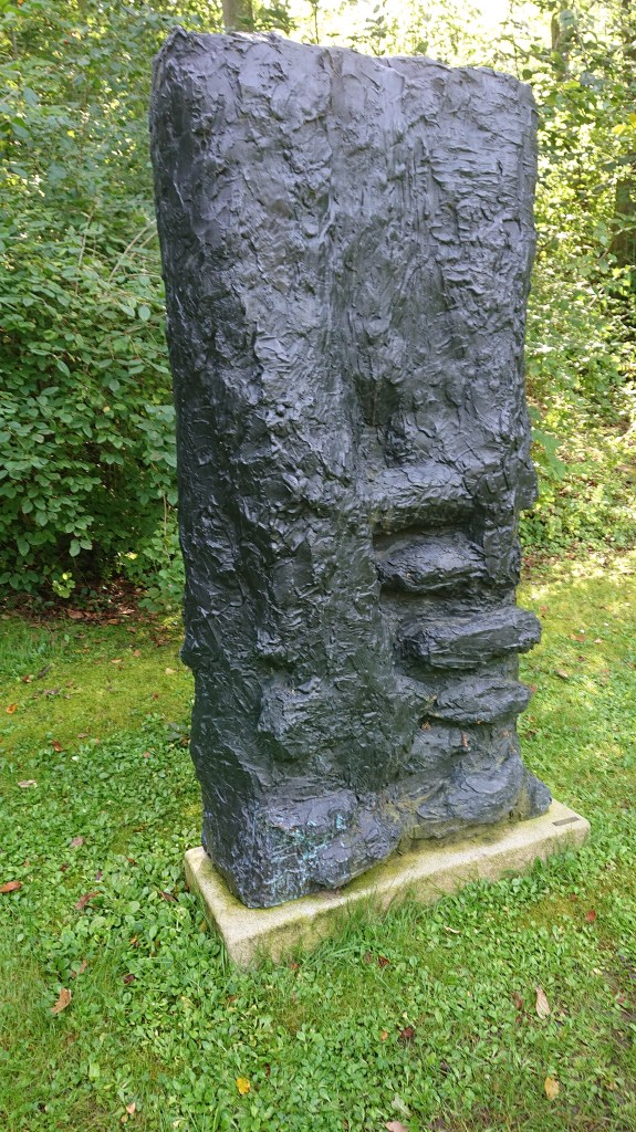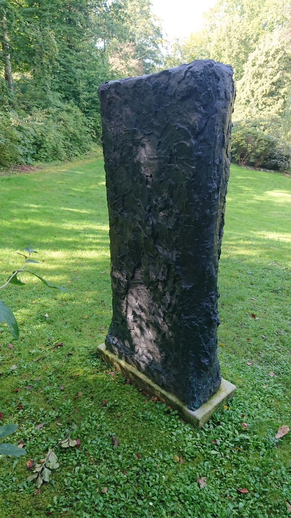 Med sol i syd på bagsiden af skulpturen står Steles forside meget sort mod den grønne bevoksning, mens den er mere grå i direkte lys. Selve overfladen er ujævn, mere ’grattet’ end ulden, og jeg har en fornemmelse af et stivnet materiale.